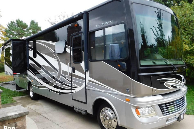 The 2015 Fleetwood Bounder 35K is a Class A motorhome renowned for its blend of comfort, functionality, and quality construction. Measuring approximately 36 feet in length, this RV is built on a sturdy Ford chassis and powered by a reliable 6.8L Triton V10 gasoline engine, offering ample horsepower for highway cruising and mountain adventures alike. The exterior features sleek, contemporary styling with full-body paint, large panoramic windows, and generous storage compartments accessible from both sides of the coach.