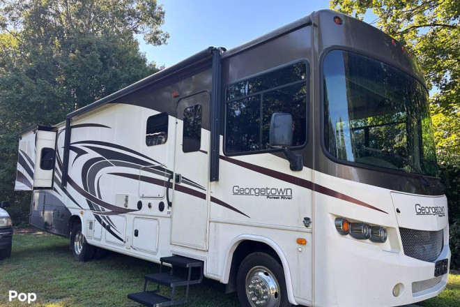 The 2016 Georgetown 335DS is a gas-powered Class A motorhome built on a Ford chassis with a Triton V10 engine.