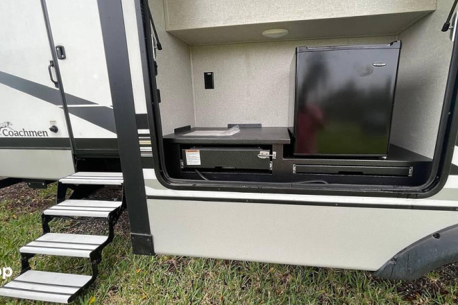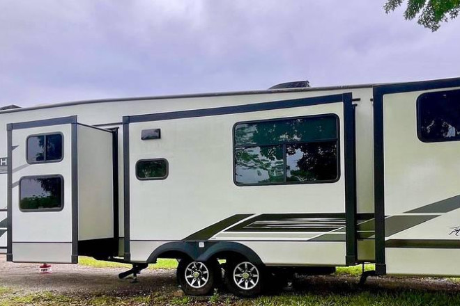There are 5 slides for lots of space. The exterior features a stove and small fridge. There's a 17' power retractable awning for lots of shade or cover on a rainy day.