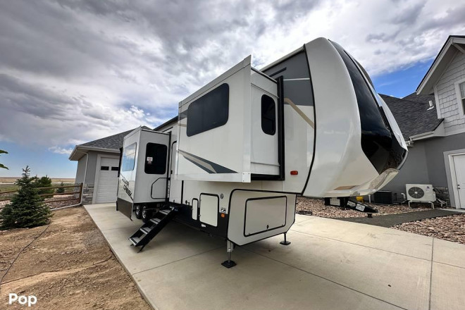 You'll love the comfort and numerous features of this 2022 Cedar Creek 371FL front living 5th wheel, which features 1.5 bathrooms, a king bed, and residential appliances in the kitchen. This RV is located in Berthoud, CO, and is in great condition.