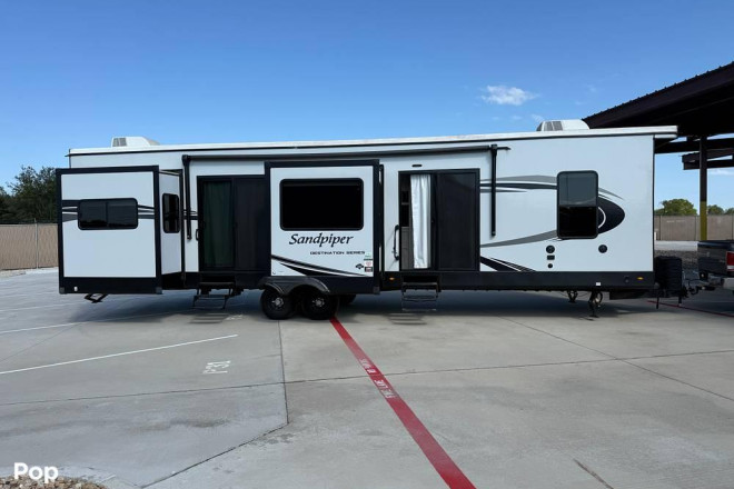 This 2022 Sandpiper 403RD is a 39' park model/destination trailer located in Terrell, Texas.