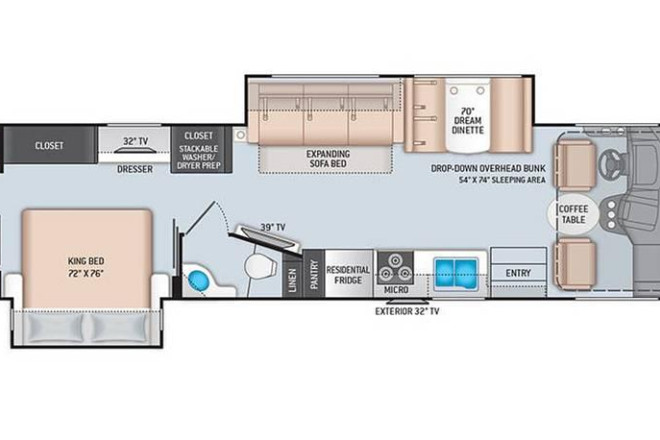 This sleeps eight, with a king-size bed in the back bedroom, a drop-down bunk over the cab, a dinette sleeper, and a sleeper sofa.