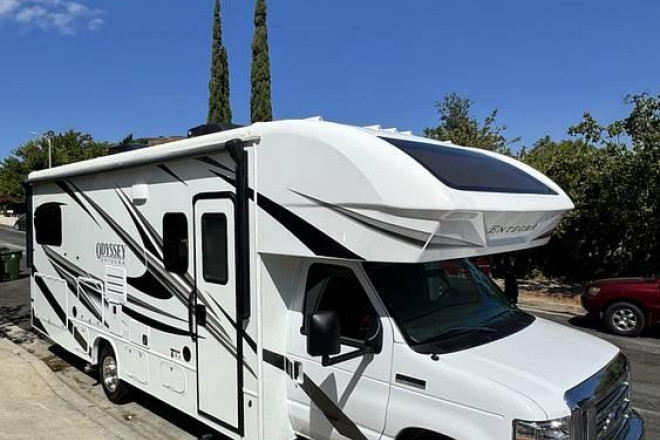 The 2022 Entegra Odyssey 25R is a Class C gas motorhome built on a rear-wheel-drive Ford E-450 chassis. Powered by a 7.3L V-8 engine that delivers 350 horsepower and 468 ft.-lbs. of torque, it also features Entegra's E-Z Drive system for enhanced handling and stability.