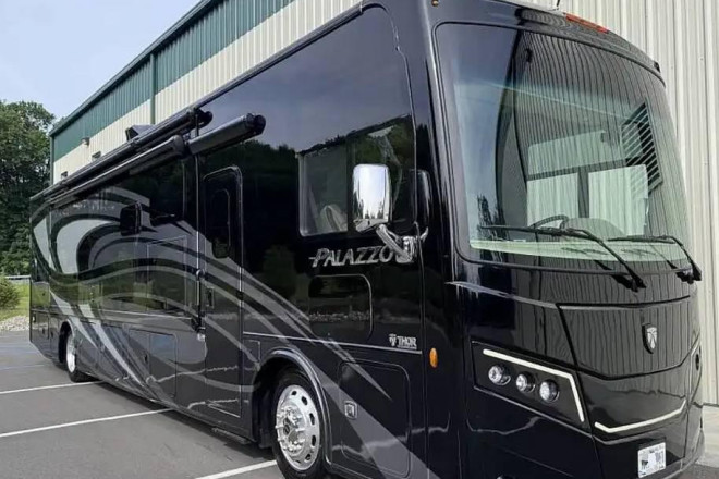 This is a 2022 Palazzo 37.5 by Thor Motor Coach. Power is supplied by a Cummins 6.7-liter diesel pusher motor. Mileage is just 13k.
