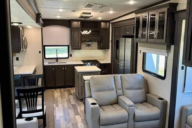 Inside, the spacious living area offers plush seating (four recliners) and an entertainment center, creating a true home-away-from-home feel. The rear kitchen is a chef's dream, with generous counter space, premium appliances, and rich cabinetry for effortless cooking.