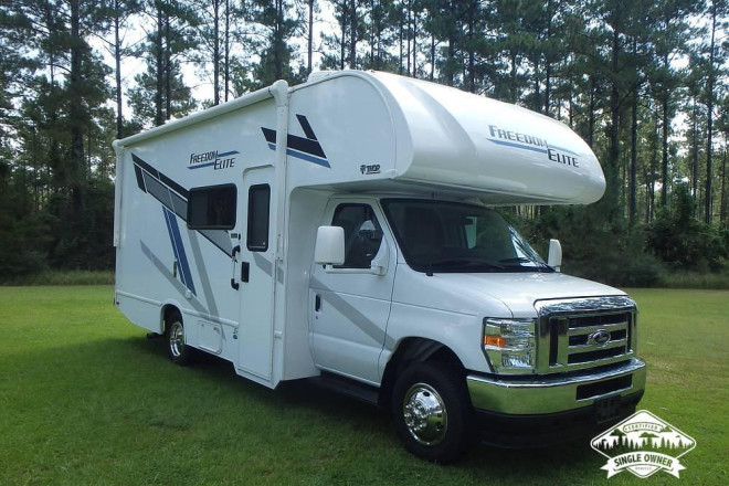 The 2025 Freedom Elite 22FE is a compact Class C motorhome, built on the Ford E-Series chassis, designed to strike a balance between maneuverability and comfort. It measures just over 24 feet in length, making it easy to handle on the road while still providing a full range of living amenities.